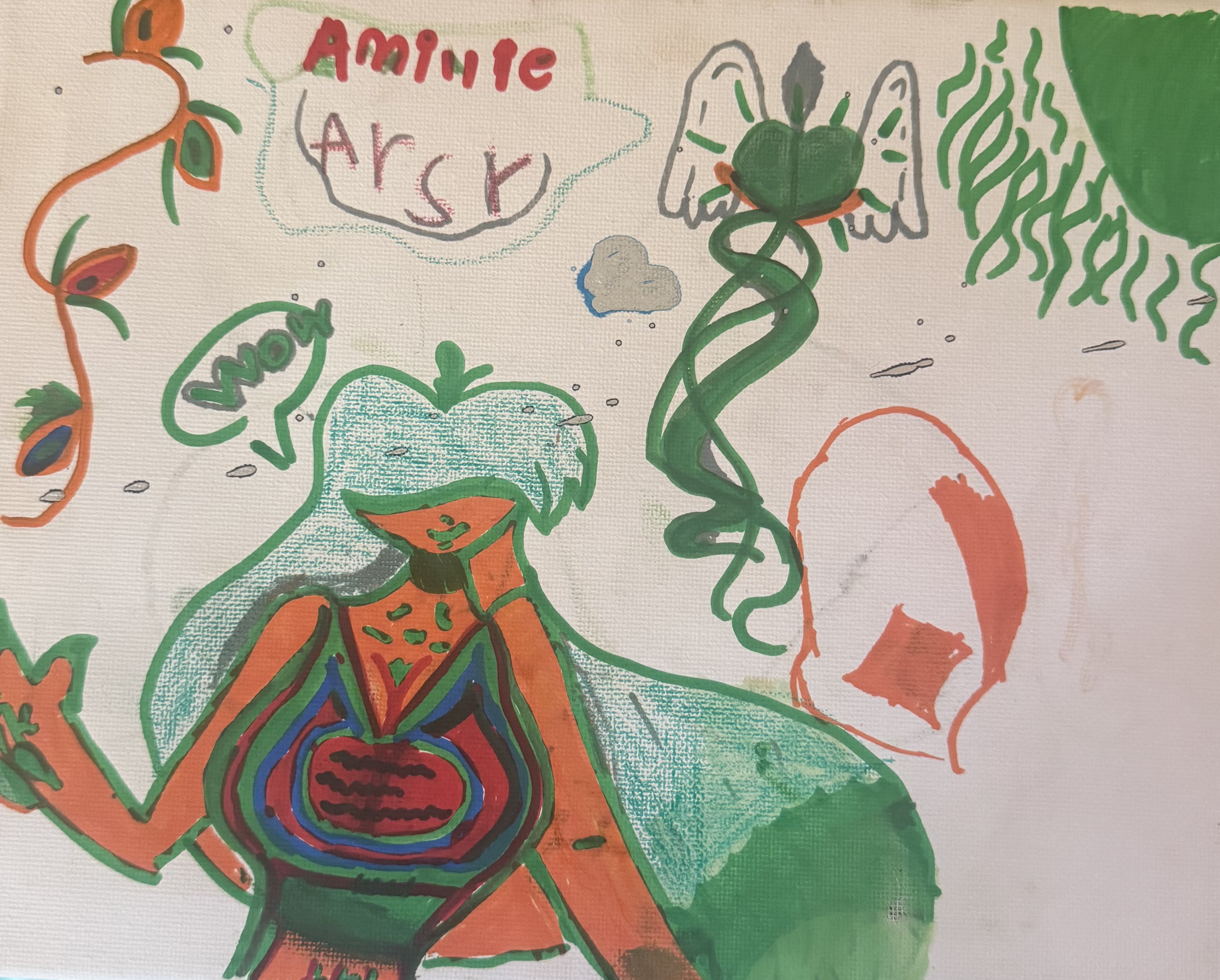 A vibrant marker portrait surrounded by vines, wings, and Amillie's signature.