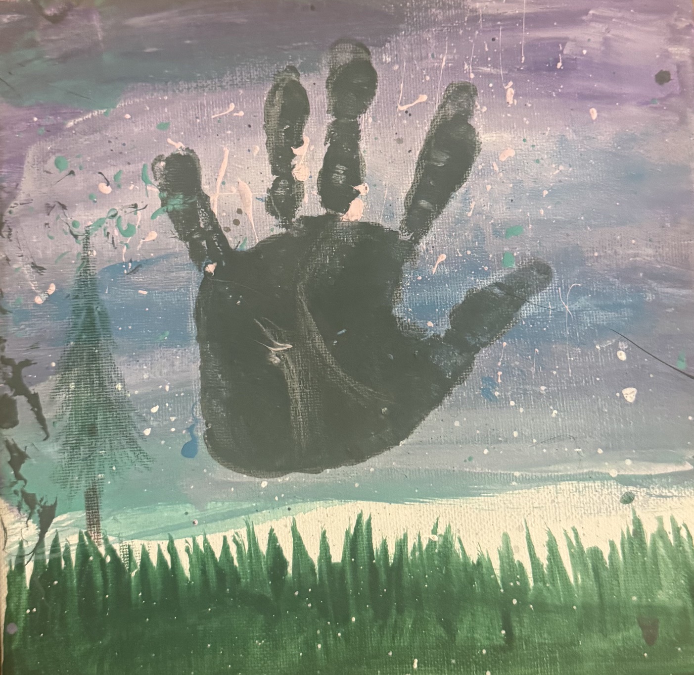 Amillie's own handprint pressed into a starry purple sky over evergreen trees.