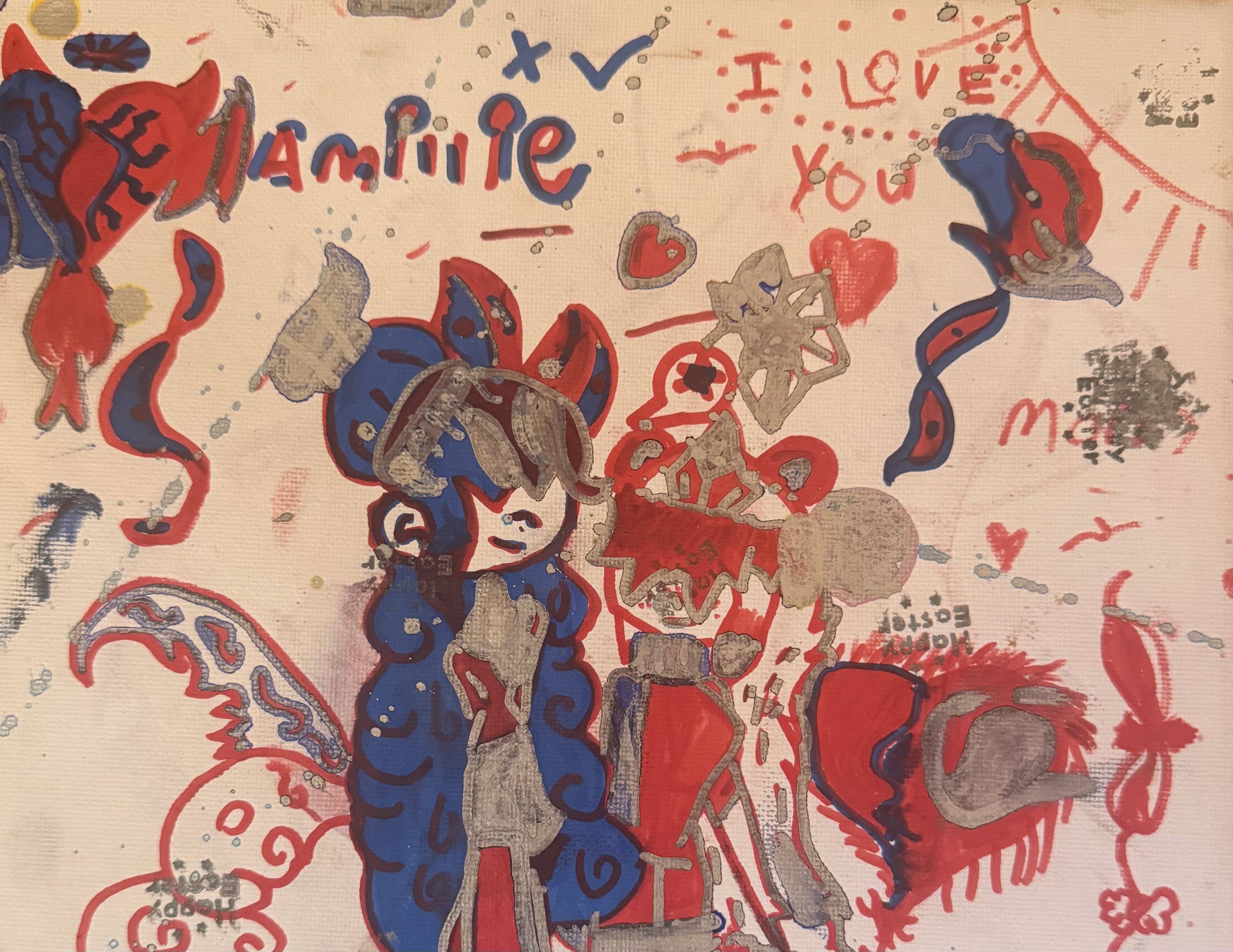 A red and blue love letter packed with hearts, ribbons, and joyful chaos.