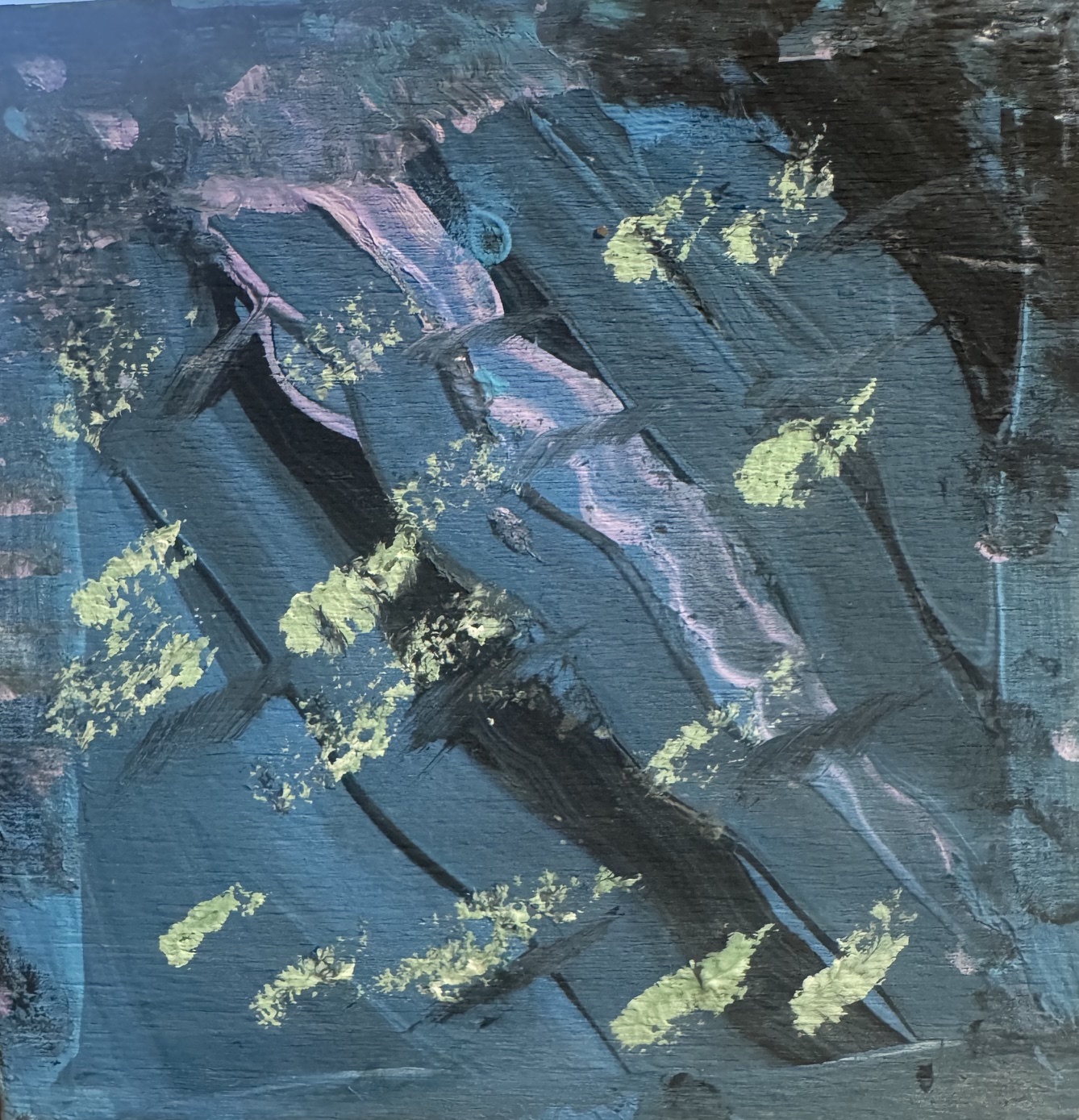 Tiny golden blossoms scatter across deep blue brushstrokes — quiet and magical.